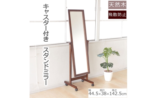 - 全身映るキャスター付きスタンドミラー ブラウン色 天然木 鏡 かがみ 飛散防止加工 キャスター付き 全身鏡 姿見 インテリア おしゃれ メイク 玄関