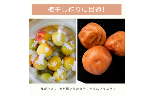 皮が薄く、果肉はやわらかくて香り豊か。種が小さく実が厚いので、梅干し作りにぴったり。漬け上がりはふっくらとした美しい梅干しになります。