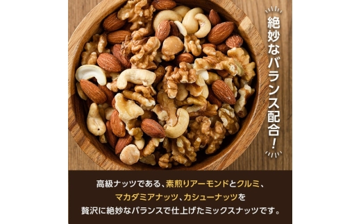 香ばしさ抜群!高級ナッツである、素煎りアーモンドとクルミ、マカダミアナッツ、カシューナッツを贅沢に絶妙なバランスで仕上げたミックスナッツです。
