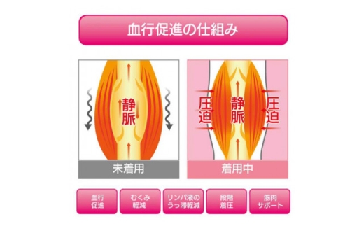 【機能】足首からふくらはぎにかけて段階的に圧迫を加えることで、筋肉の収縮運動を助け、リンパ液、静脈の流れを改善する。足首部圧迫圧はふくらはぎ部より大きい。