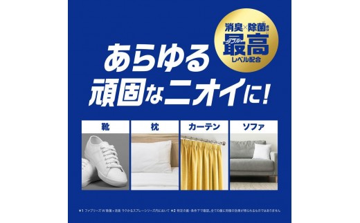 消臭成分も除菌成分も最高レベル配合* 肌に触れる衣類やお子さまのいる家庭での使用もOK!枕やマットレスにソファやカーペットに梅雨や衣替え時期に外出後のニオイに使用回数:●約360回スプレーできます。 *ファブリーズW除菌+消臭 ラクかるスプレーシリーズ内において。特定の菌・条件下で実験。全ての菌に同様の効果が得られるものではありません。 ※寄付者様のご都合による注文キャンセルはお受けできません。 ※商品のリニューアル時期によってサイト掲載のパッケージと異なる場合がございます。