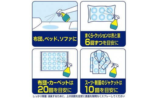 消臭成分も除菌成分も最高レベル配合* 肌に触れる衣類やお子さまのいる家庭での使用もOK!枕やマットレスにソファやカーペットに梅雨や衣替え時期に外出後のニオイに使用回数:●約360回スプレーできます。