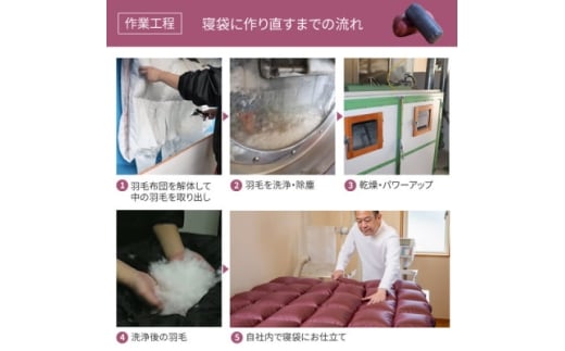 古くなった羽毛ふとんの羽毛を取り出し、キレイに洗浄後、パラシュートにも使われる軽くて丈夫な特殊ナイロン生地に詰め替えて、アウトドアや防災の備えとしても使える本格的な寝袋に作り替えます。