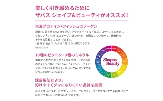 引き締めたいカラダづくりに有効な大豆プロテインと美容をサポートするコラーゲンを合わせてたんぱく質12.5gと、運動する女性に必要な鉄分・ビタミンB6、B12、葉酸、ビタミンDを配合し、すっきりと飲みやすいやさしいキャラメル風味に仕立てたので、運動後に摂取することで喉の渇きを癒しながら、女性のカラダづくりをサポートできるプロテインドリンク「(ザバス)Shape&Beauty キャラメル風味」