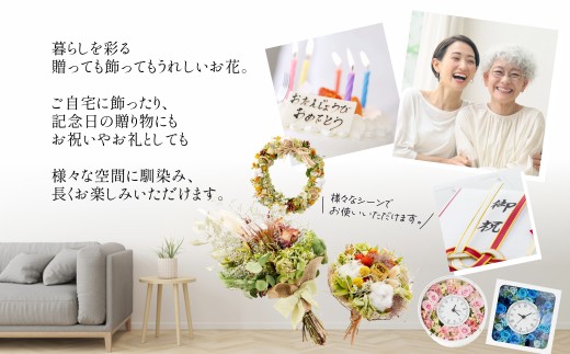 【提供】花ドーム(株) 当店にて乾燥させてできたドライフラワーで製作。ナチュラルな色味がインテリア空間に癒しを与えてくれます。 ※季節により花材が変わることもございます。また、ハンドメイドの為、形や大きさに誤差がございます。  箱から取り出す時や壁に掛ける時など多少お花が落ちることがございます。 【検索ワード】 プリザーブドフラワー ブリザードフラワー ドライフラワー プリザーブド ブリザード ドライ ギフト プレゼント 贈り物 母の日 父の日 敬老の日 誕生日 記念日 お祝い 祝