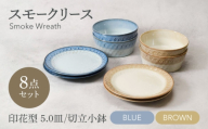 【美濃焼】スモークリース 印花型 8.0皿 3.6小鉢 各2点 合計4点 セット ブルー&ブラウン【カネ定製陶】 [MEI209-3]