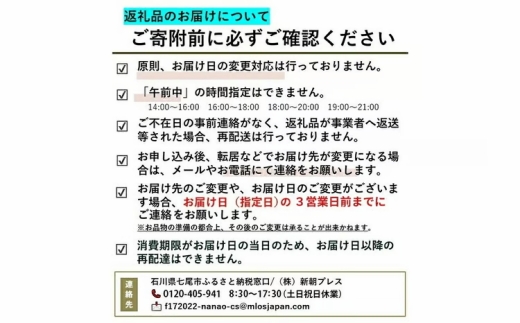 解冷凍品にはないプリプリ・コリコリ感のあるおさしみを是非お召し上がり下さいませ。お刺身には石川県の県木でもある能登ひばと縁起のよい南天をお添えしています。ご自宅にいながら能登半島を旅したような気分を味わっていただければ幸いです。四季折々の海の幸、新鮮な魚介をより美味しく召し上がっていただきたいという思いから、届いた日が賞味期限とさせていただきます。