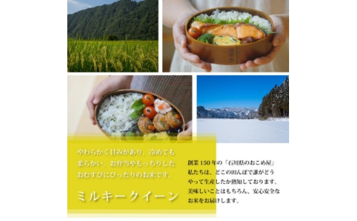 コシヒカリの血統を受け継ぐミルキークイーンは、低アミロースで粘りが強く、炊き立てはもちろん冷めてももっちり食感が続きます。