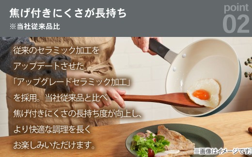 セラミック加工されたフライパンは熱伝導がよく、さらに遠赤外線効果で中までしっかりと熱が加わるため、食材の旨みをギュッととじこめます。