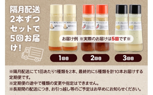 - 【1種類2本ずつ隔月で5回お届け】自家製・群馬産野菜で手作りドレッシング(くるみ、みそごま、シーザー、玉ねぎ、えごま)お野菜嫌いなお子様も喜ぶ!セット 全5回で全種類堪能 定期便 200ml×2本 泙川食品 [どれっしんぐ 胡桃 クルミ 味噌 胡麻 ミソ ゴマ しーざー 玉葱 タマネギ 荏胡麻 エゴマ]