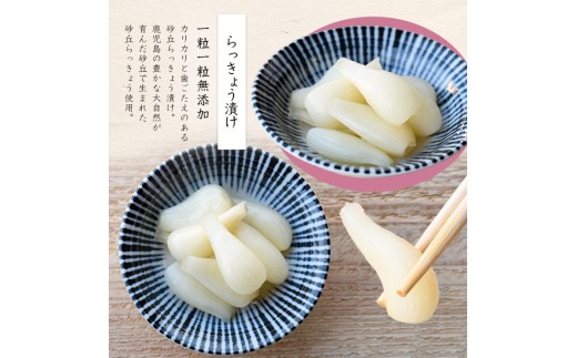 らっきょうは鹿児島産の砂丘らっきょうを使用しており、らっきょう本来の素材の苦味や風味を生かすように、塩・酢をそれにあった配分で独特なきめ細かい食感を楽しんでいただけるように漬け込んであります。