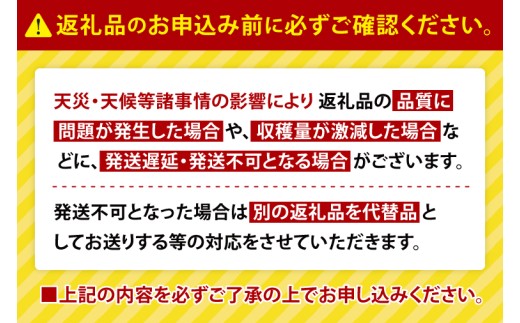※天災・天候等諸事情の影響により返礼品の品質に問題が発生した場合や、収穫量が激減した場合などに、発送遅延・発送不可となる場合がございます。発送不可となった場合は別の返礼品を代替品としてお送りする等の対応をさせていただきます。予めご了承ください。