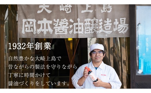 1932年に創業した『岡本醤油醸造場』。かつて瀬戸内海は船を中心とした物流の要所であり、大崎上島では塩作りも盛んだったため、醤油の原料である良質の大豆、小麦、塩が入手できました。さらに瀬戸内ならではの温暖な気候は醤油造りの際に重要となる“醗酵”にも適しているため、創業以来変わることなく、昔ながらの天然醸造が貫かれています。素材はすべて国産。伝統の杉の木桶で造る醤油です。