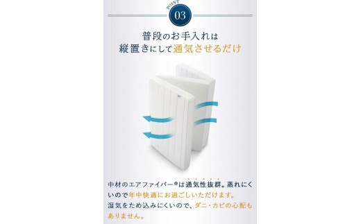 エアウィーヴの特長である寝返りのしやすさや優れた体圧分散はそのままに、一枚敷き可能な三つ折りマットレスです。