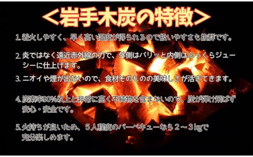 岩手木炭は岩手県独自の構造を持つ岩手窯を使用し、約800℃の高温でじっくり時間をかけて製炭しているため、固定炭素率が平均90%と非常に多く、不純物が少ない高品質な黒炭です。