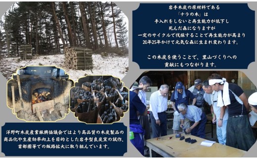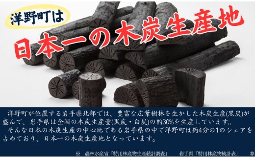 洋野町が位置する岩手県北部では、豊富な広葉樹林を生かした木炭生産(黒炭)が盛んで、岩手県は全国の木炭生産量(黒炭・白炭)の約30%を生産しています。 そんな日本の木炭生産の中心地である岩手県の中で、洋野町は、約4分の1のシェアを占めており、日本一の木炭生産地となっています。