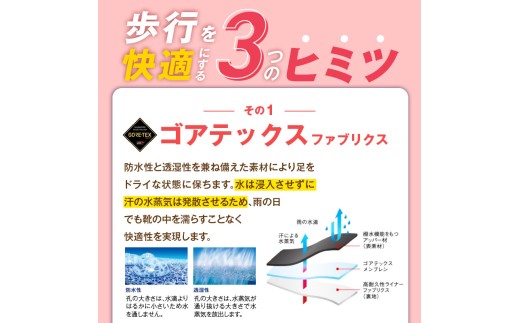 濡れにくい、蒸れにくい、滑りにくい。雨の日も安心の一足。 レディースショートブーツ。 優れた防水性と透湿性を兼ね備えたゴアテックスファブリクス採用。 特殊素材を使用したグリップ性の高い靴底で滑りにくい。 【ご注意事項】 ※在庫が無い場合は2ヶ月程度お待ち頂くことがあります。 地場産品基準:3号 基準に該当する理由:区域内で製造等全般を行っている靴であり、当該工程を経て完成した当該返礼品等の付加価値のほぼ全てが当該工程によるものであるため