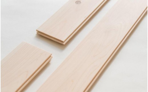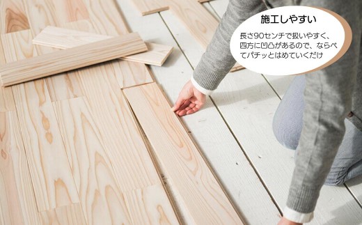 長さ90×幅10×厚み1.35cmの床材の四辺に実(さね)と呼ばれる凹凸があり、凹凸をパチッとはめ込んでいくだけで、簡単に無垢のフローリングを張ることができます。表面の節には埋節、パテ埋めなどの表面処理を施しているので滑らかです。