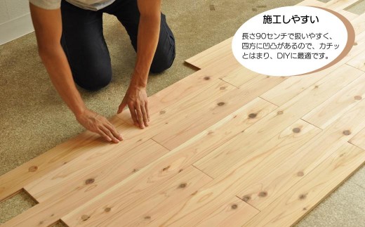 軽くて持ち運びが容易で、エンドマッチ加工を施し四方に凹凸の実(さね)があることで施工性に優れ、DIYでも扱いやすい仕様。