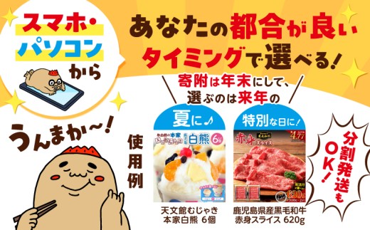 ふるさとギフト券にご寄附いただき、後日、交換サイトにて、肉・お酒・うなぎなど鹿児島市自慢の特産品に交換することが可能です。