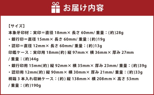 卓越した職人が歴史と伝統ある山梨文字にて、真心を込めて彫刻する印鑑です。実印用の18mm、銀行印用の15mm、認印用の12mmの3本セット。貴重なアフリカゾウの牙を使用。種の保存法に基づく「認定シール」付。背ワニ革を使った印鑑ケースと桐箱付。後日お送りする申込書に、刻印内容をご記入の上、ご返送ください。