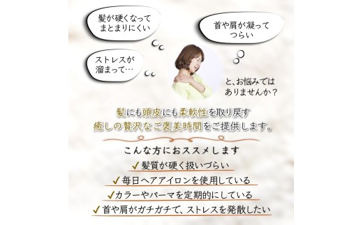 髪質だけでなく頭皮や首・肩、自律神経も整える贅沢なご褒美タイムで、癒しのひと時をぜひお過ごしください。