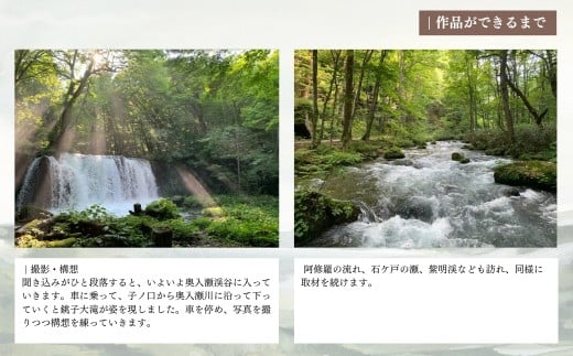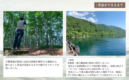 「春宴」 2018年 制作 リミッテッド・エディッション 500 スケッチ場所:長野県 大町 版画家・小暮真望(こぐれしんぼう)は、瀬戸内海、尾瀬や上高地をはじめとした日本各地の風景を愛し、 繊細な版画表現によって貴重な自然美を人々に伝えてきました。 葉ずれの音が聞こえそうな繊細な筆致と躍動感あふれる大胆な構図、そして艶やかに彩る空気感の表現は、 多くの人々に感動を与え、国内だけでなく欧州を中心とした海外でも高い評価を得ています。 登山家・深田久弥の随筆に感銘を受けて、小暮真望が独自に選んだ日本百名山シリーズの制作は 版画家としてのライフワークとなり、さらには、丹頂鶴の連作、世界の名峰、北海道の大地や 瀬戸内の海などその表現の対象は多岐にわたり、自然美への飽くなき探求を続けてきました。 小暮真望のシルクスクリーン版画の世界には、だれもが心に抱く「ふるさとの風景」があります。 【地場産品に該当する理由】3号/製品の主要な製造・加工を市内で行っており、相応の付加価値が生じているものであるため