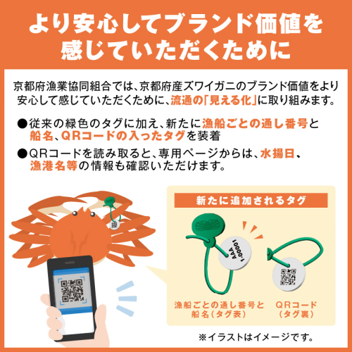京都を代表するブランド蟹である間人蟹(京丹後市間人港産)を、姿のまま千翔独自の塩加減と茹で加減で仕上げた茹で蟹(ボイル済)です。赤い甲羅に映える緑色のタグは、日本屈指のカニ漁場である丹後沖にて、数隻の蟹漁船による日帰り操業にて水揚げされたズワイガニであることの証です。