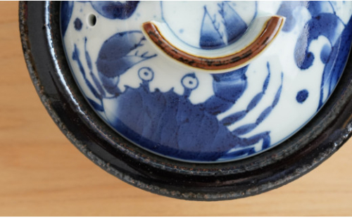 • 有田焼 ふくせん窯 くらしの料理器 染付カニ絵なんでん鍋 土鍋 ご飯 炊飯 ごはん 一人用(1人用)二人用(2人用)直火専用鍋 耐火陶土 A35-233