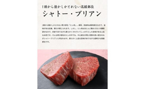 シャトーブリアンは、1頭から僅かしかとれない希少部位「ヒレ」の中でも、中心部分の特に肉質の良い部分のみから取られる高級部位。