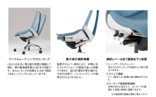 アンクルムーブ・シンクロロッキング、シートアングルストッパー、ロッキング強弱簡易調節、ペンディングシート、ガス上下調節、座の奥行調節、キャスター:抵抗付きウレタン双輪キャスター(硬質床に適しております。)