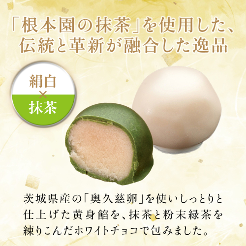 奥久慈卵を使った黄身餡をホワイトチョコで包んだ絹白と、海を渡った初の日本茶『さしま抹茶』の贅沢な香りと旨味の抹茶味。
