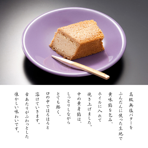 高級バターをふんだんに使った生地で黄味餡を包み、ホイルに入れて焼き上げました。黄味餡は、白いんげん豆と高級白ざら糖で練り上げた白餡に『奥久慈卵』の黄身をたっぷり使い、まろやかな味に仕上げました。