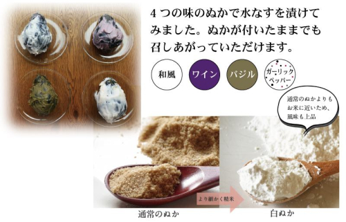 水なすの青果(2個)、白ぬか漬け(お届け予定風味:和風、ガーリックペッパー 各1個)計4個