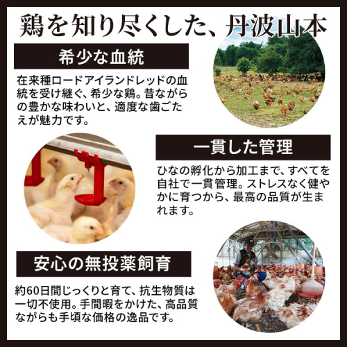 「丹波赤どり」は、清らかな水と澄んだ空気に恵まれた自然豊かな丹波の地でゆっくりのびのびと育てた銘柄鶏です。フランスにルーツを持ち、約60日間飼育しております。臭みが無く、ほどよい歯ごたえと上質な旨みが特徴です。