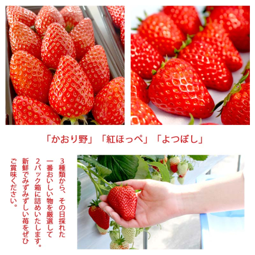 かおり野・紅ほっぺ・よつぼしの中から、その日いちばん状態の良い品種を厳選し、2パックに詰めてお届けします。