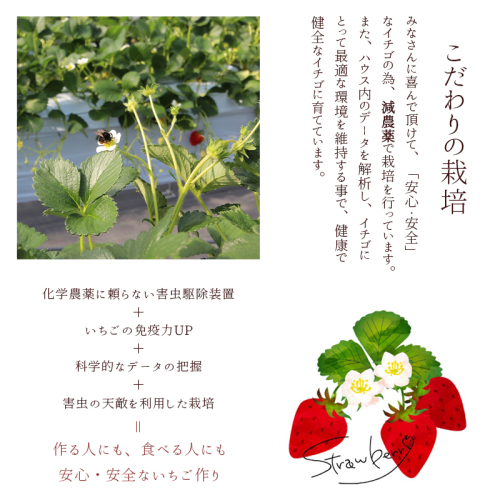 みなさんに安心して召し上がっていただけるよう、減農薬にこだわったいちご栽培を行っています。