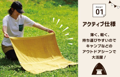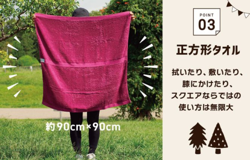 ミニバスタオルとして使うのはもちろんのこと、ネームタグがフックにもかけられるアースカラー全6色の正方形タオルはアウトドアシーンでも拭いたり、敷いたり、膝にかけたり、スクエアならではの使い方は無限大です。