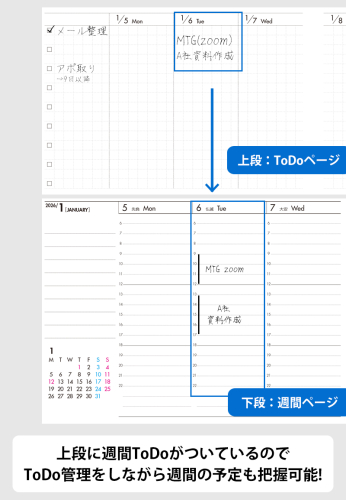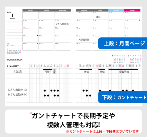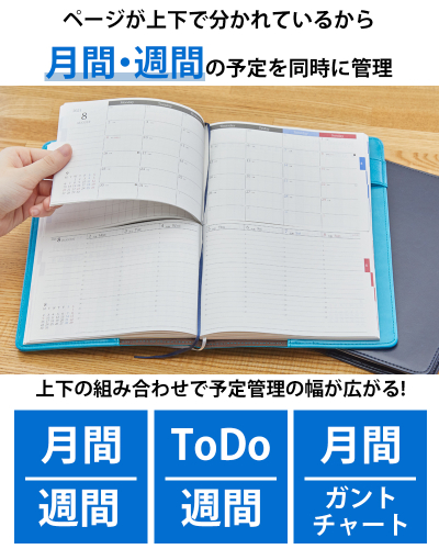 上下ページの組み合わせにより「月間ページ」、「週間ページ」、「TODOページ」、「ガントチャート」を同時に確認することができます。マンスリーページで全体の予定を把握しながら、週間ページで1週間の予定を組むことができます。時間軸で予定を管理することで、スキマ時間を見つけやすくなり、時間を有効に使うことができます。TODOページは、日々のやる事を整理することが可能です。書き出すことで優先順位が明確になったり、タスク漏れの防止にも繋がります。細かい予定管理に最適なため、ビジネスシーンはもちろん、ダブルワーカーの方や忙しいママさんにもおすすめの手帳です。