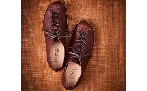 奈良県大和郡山市は日本有数の革靴の産地。この地で昔からひたむきに革靴作りに向き合ってきた靴メーカー7社が共同開発した革靴「KOTOKA」はシンプルで履きやすいデザインが特徴。甲革に鎌倉時代に遡る歴史を持つ日本最大の革の産地、兵庫県たつの市で、特に丁寧な加工で評価の高いタンナー「マルヒラ」で、植物タンニンで二次なめしされた革を使用。製造過程で通常2回使用するドラムを、なめし、染め、蝋引き、揉みの計4回使用し、手間をかけてつくられた革です。色ムラやシワが、履くほどに深味わいを醸し出します。古都ラインの靴はこの革の風合いを生かした、シンプルで履きやすく、飽きのこないデザインの靴です。