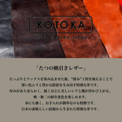 奈良県大和郡山市は日本有数の革靴の産地。この地で昔からひたむきに革靴作りに向き合ってきた靴メーカー7社が共同開発した革靴「KOTOKA」はシンプルで履きやすいデザインが特徴。甲革に鎌倉時代に遡る歴史を持つ日本最大の革の産地、兵庫県たつの市で、特に丁寧な加工で評価の高いタンナー「マルヒラ」で、植物タンニンで二次なめしされた革を使用。製造過程で通常2回使用するドラムを、なめし、染め、蝋引き、揉みの計4回使用し、手間をかけてつくられた革です。色ムラやシワが、履くほどに深味わいを醸し出します。古都ラインの靴はこの革の風合いを生かした、シンプルで履きやすく、飽きのこないデザインの靴です。