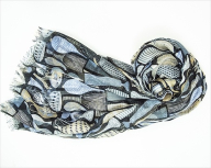 北欧の香り漂う美しいイラストが武藤の絶妙に透ける生地感に載った瞬間に軽やかな動きを手に入れ、それはよく見かけるプリントストールとは別格の存在感。