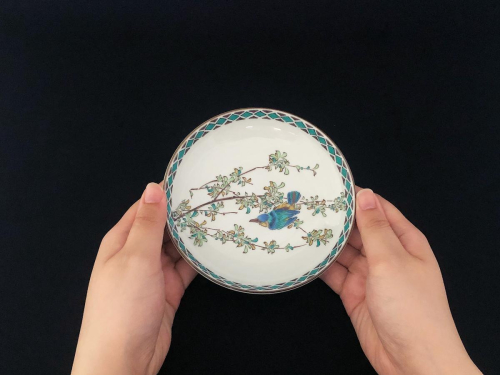 石川県の伝統工芸品、九谷焼の皿揃です。かわせみが描かれており、落ち着いたデザインのお皿になっています。