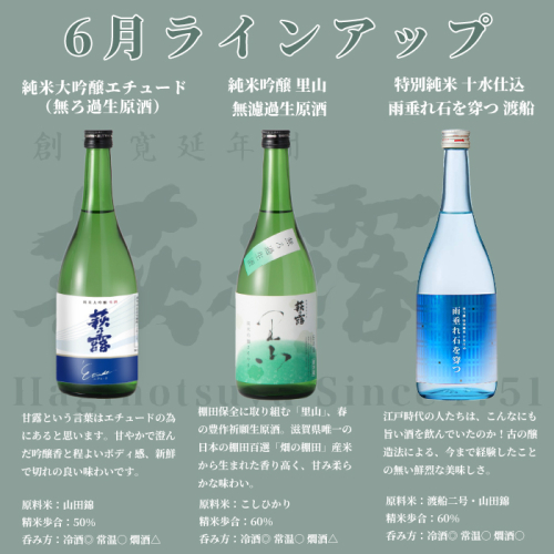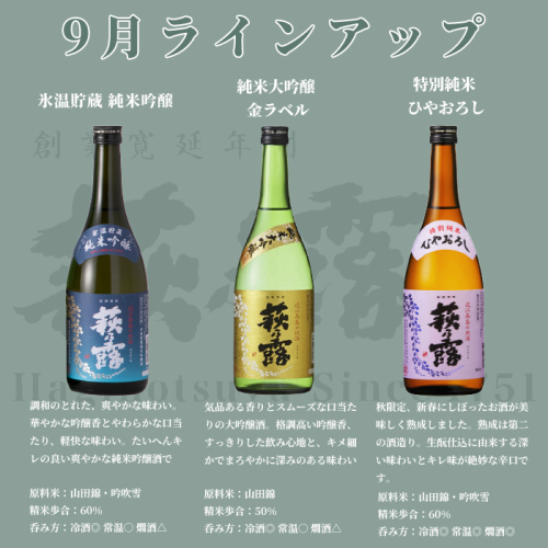 毎回違ったお酒を楽しめる頒布会。萩乃露のバリエーション豊富な旬のお酒を3か月に1度、一年間お届けします。