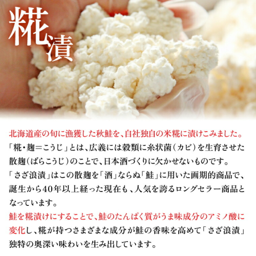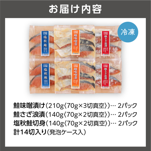 北海道の9月~10月に獲れた秋鮭で味噌・糀(さざ浪漬)の3つの味の切身に製造しました。3種で合計14枚。2枚入り、3枚入りと食べきりサイズ。
