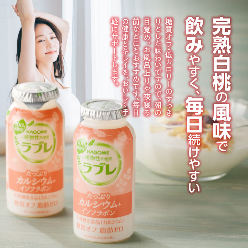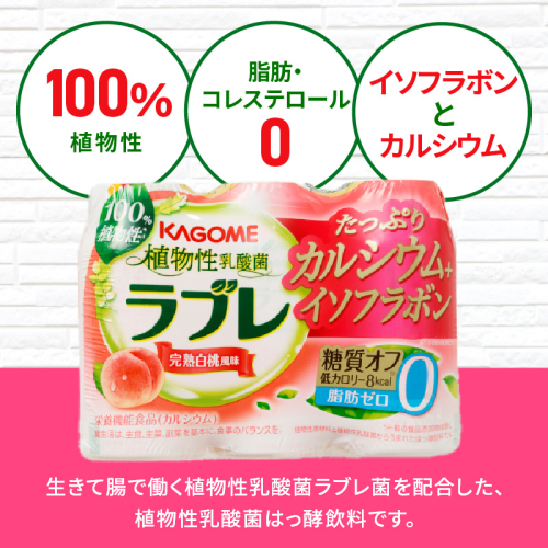 生きて腸で働く植物性乳酸菌ラブレ菌を配合した、植物性原材料と植物性乳酸菌からうまれた植物性乳酸菌はっ酵飲料です。植物性乳酸菌ラブレ菌に加え、イソフラボンと骨や歯の形成に必要なカルシウムが摂取できます。乳などの動物性原料不配合、100%植物性*で脂肪・コレステロール0。完熟白桃の風味で飲みやすく、毎日続けやすい糖質オフ・低カロリーのすっきりとした味わいですので、朝の目覚め、お風呂上りや夜寝る前などにもおすすめです。毎日の健康とキレイを、おいしく手軽にサポートします。