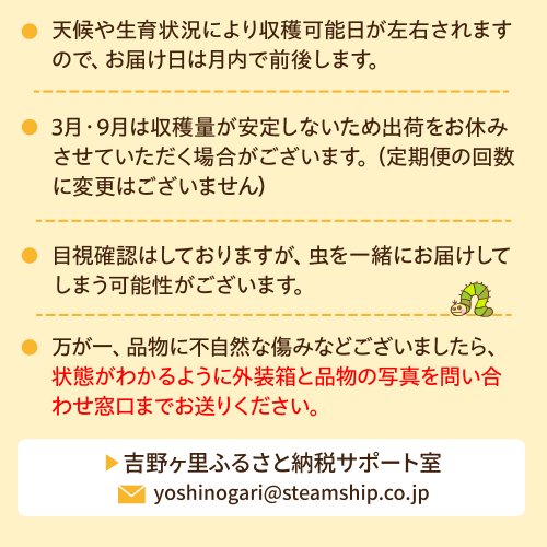 ※生育状況や天候により収穫日が左右されますので、毎月お届け日も前後いたしますので、あらかじめご了承ください。