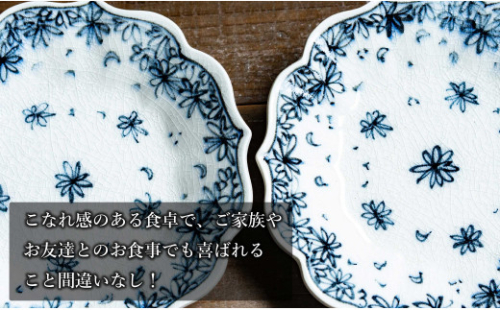 ■桔梗渕の形でかわいくアクセント!こなれ感のある食卓が完成! 食卓をコーディネートするのって、プロでもなければとても難しいですよね。 おしゃれで、かわいい食卓にするために、 器の絵柄や色味を考える他に、形でアクセントをつけてみませんか。 喜鶴製陶の桔梗皿(小)は、花をモチーフにしたかわいい形で、取り皿にちょうどいい大きさで、大活躍してくれます。 こなれ感のある食卓で、ご家族やお友達とのお食事でも喜ばれること間違いなし! ■手描きの小花がかわいい。 手描きで描いた小花がお皿のまわりをまるでリースのように彩った絵柄です。 周りをお花で囲っているので、料理映えもよいお皿です。 ■暮らしに、手しごとを感じる器を。 忙しない現代社会だからこそ、過ごしたい丁寧な日々。 家族と一緒に、友人と一緒に、大事な人と一緒に囲む食卓だから、 手しごとを感じる器を並べて、 何気ない時間を大切に過ごしませんか。 窯元:喜鶴製陶 喜右エ門 提供:合同会社 喜鶴製陶