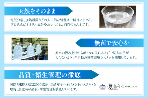 世界的にも希少な「硝酸態窒素」が不検出の天然水で、硬度50ml/Lの軟水でミネラルバランスも良く、喉越しはまさに日本人好み。
