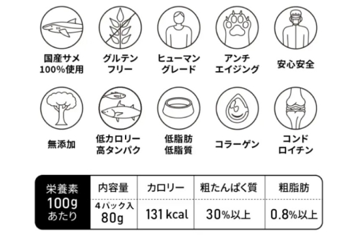 粗たんぱく質30%以上、粗脂肪0.8%以上、粗灰分1.5%以下、粗繊維0.1%以下、水分72%以下、エネルギー131kcal(ME)【100gあたり】